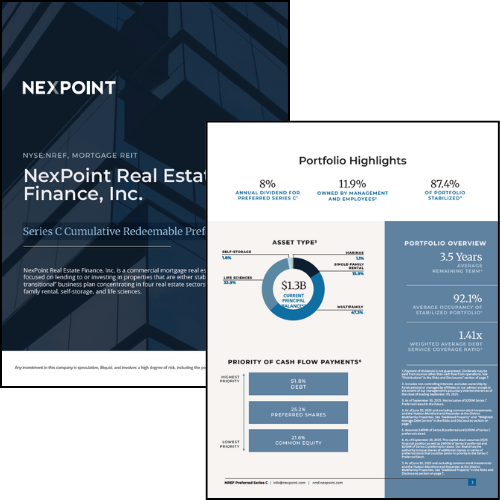 NexPoint Real Estate Finance, Inc. (“NREF”) is a commercial mortgage real estate investment trust (“REIT”), with its shares of common stock and Series A Preferred Stock listed on the New York Stock Exchange under the symbols “NREF” and “NREF-PRA.” The company concentrates on investments in real estate sectors where senior management has operating expertise, including multifamily, single-family rental (”SFR”), self-storage and life science sectors in the top 50 metropolitan statistical areas.