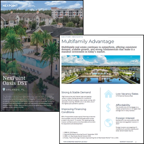An offer to sell interests (“Interests”) in NexPoint Oasis DST (the “Parent Trust”) may be made only pursuant to the PPM, which is available upon request. Distributions are not guaranteed. Please review the entire PPM prior to investing. Reference is made to the PPM for a state-ment of risks and terms of the Offering. The information set forth herein is qualified in its entirety by the PPM. All potential Purchasers must read the PPM and no person may invest without acknowledging receipt and complete review of the PPM. The offering of Interests (the “Offering”) is being made by means of the PPM only to accredited investors who meet minimum accreditation requirements, as well as suit-ability standards as determined by a qualified broker-dealer or investment advisor. The contents of this communication may not be relied upon in making an investment decision related to this Offering. All prospective Purchasers must read the PPM, including the “Risk Factors” section, any discussion of fees and expenses, and other pertinent information prior to investing. These investment opportunities have not been registered under the Securities Act of 1933 and are being offered pursuant to an exemption therefrom and from applicable state securities laws.