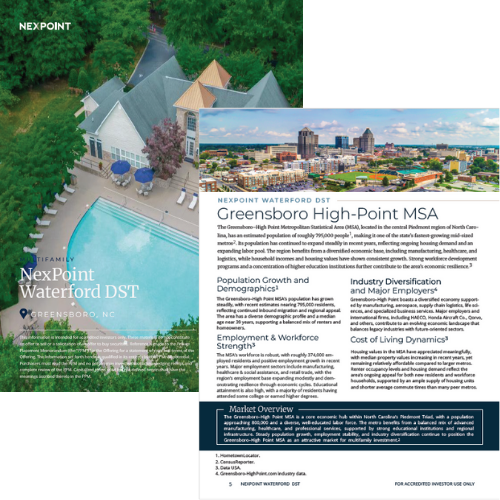 Introducing NexPoint Waterford DST, a multifamily offering centered on a low‑density residential community located within the Greensboro MSA, with a forecasted 4.51% Year-1 cash flow and a 48.6% LTC. NexPoint believes this offering is supported by the asset’s differentiated characteristics, including spacious floor plans with sunrooms, a comprehensive amenity package, and limited nearby competitive supply. Combined with targeted value‑add initiatives and favorable local economic drivers tied to aerospace and advanced manufacturing investment.